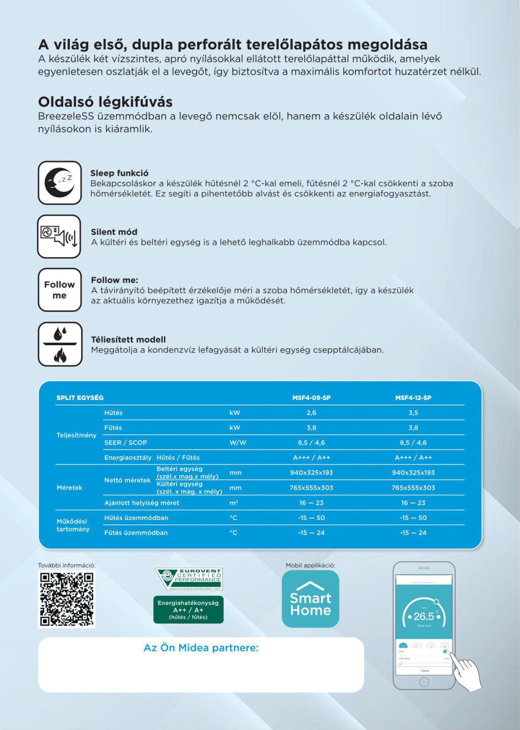 Az MSF4-12-SP Breezeless oldalfali split klíma egy korszerű, energiatakarékos légkondicionáló berendezés, amely ideális választás közepes méretű helyiségek hűtésére és fűtésére. A Breezeless funkció gondoskodik az egyenletes és kellemes hőmérséklet-eloszlásról, míg a beépített WIFI vezérlés lehetővé teszi a készülék távoli irányítását okostelefonról.